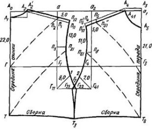 Построение чертежа модели. Обводятся основные детали: верхняя часть спинки, верхняя часть переда, нижняя часть спинки, нижняя часть переда. На контуры наносятся линии груди и линии, ограничивающие ширину спинки, переда. Подробнее...